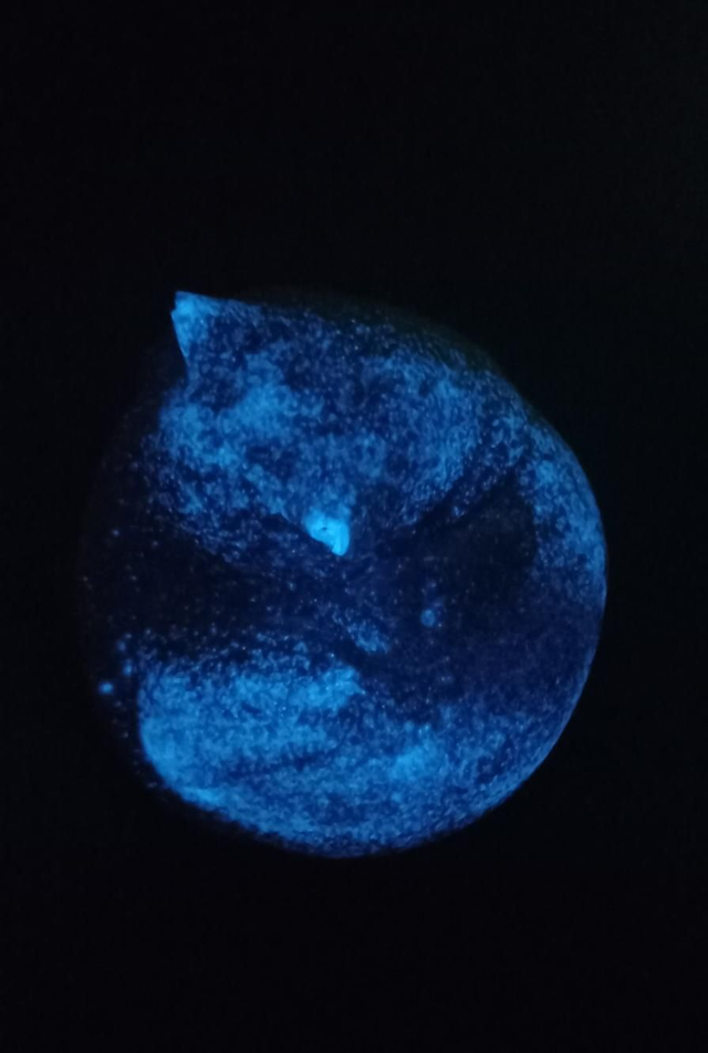 Petit chaton luminescents blanc qui s'éclaire bleu la nuit.