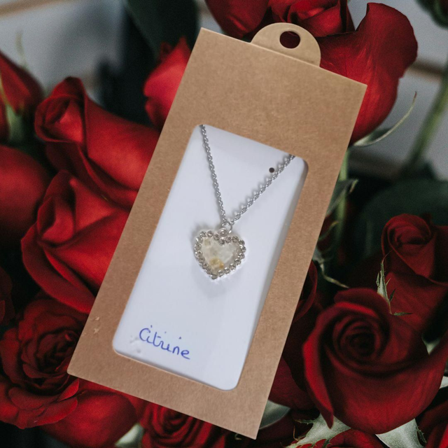 Collier cœur strass avec insertion résine uv et pierre gemmes Citrine. Chaîne en acier inoxydable 304. Taille 50cm.