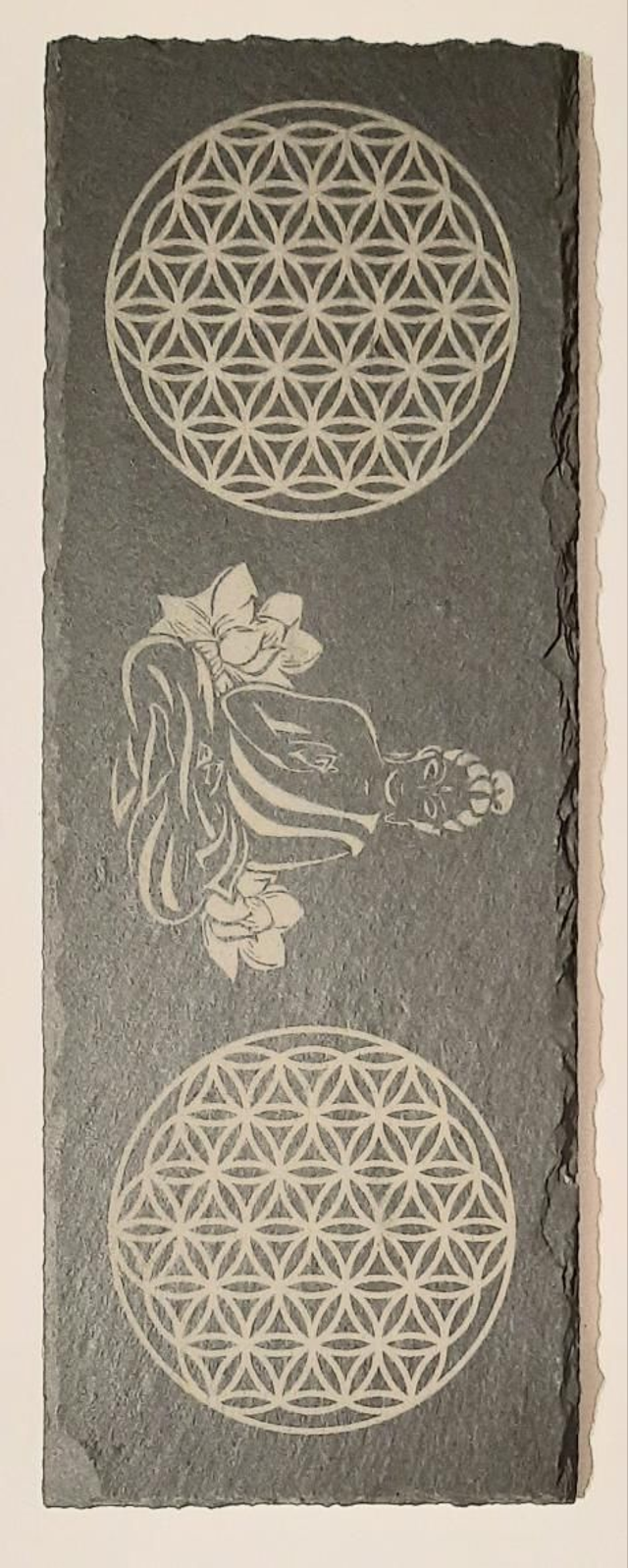 Dessous de verre en ardoise.Gravure laser 2 fleurs de vie et un bouddha. Taille 10cm sur 30cm