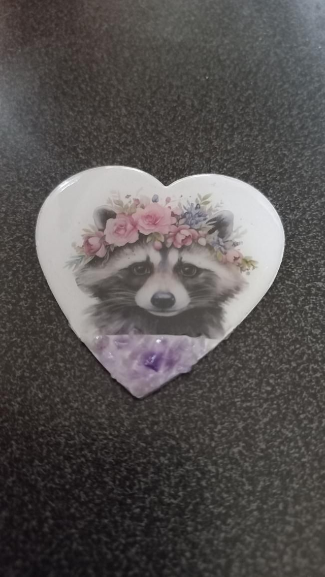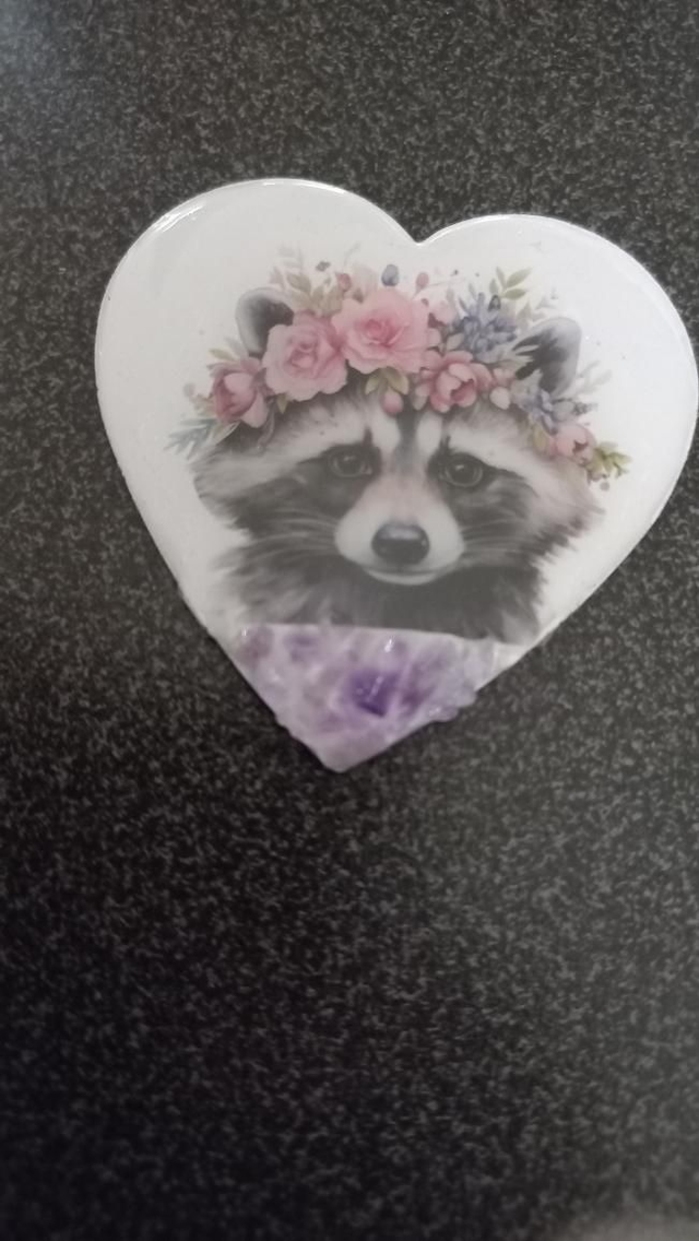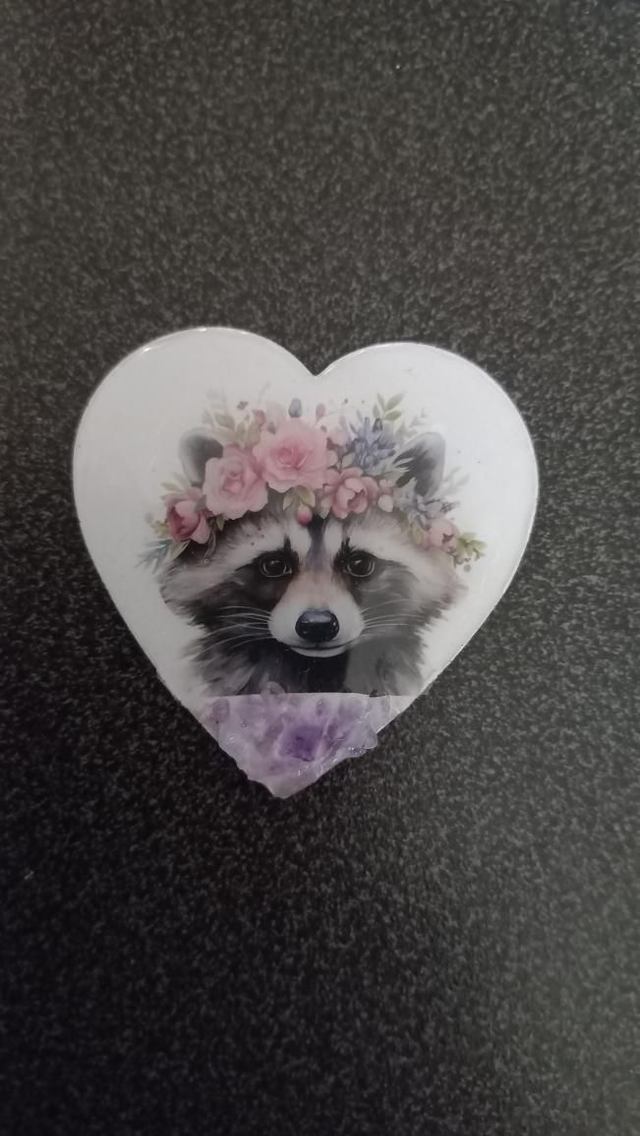 Magnet avec un joli raton laveur et sa couronne de fleur avec insertion pierres gemmes Améthyste