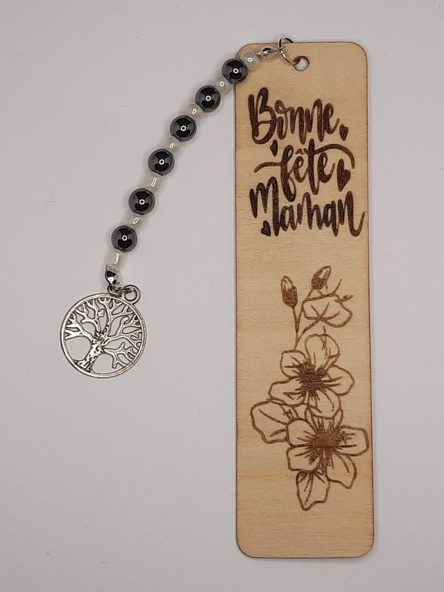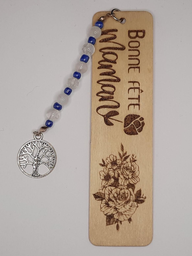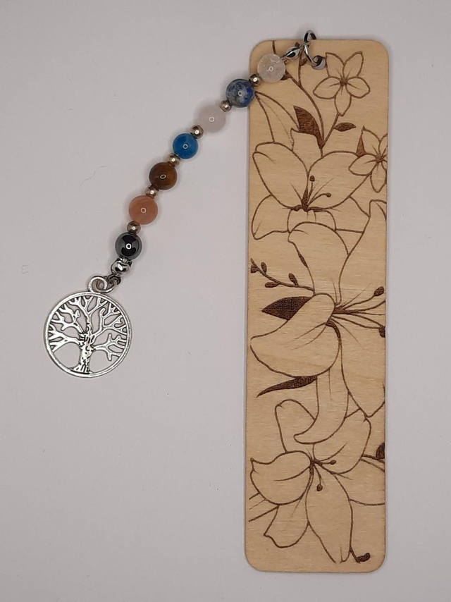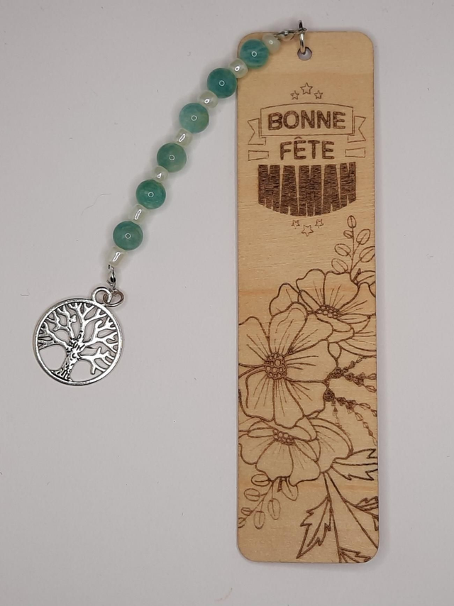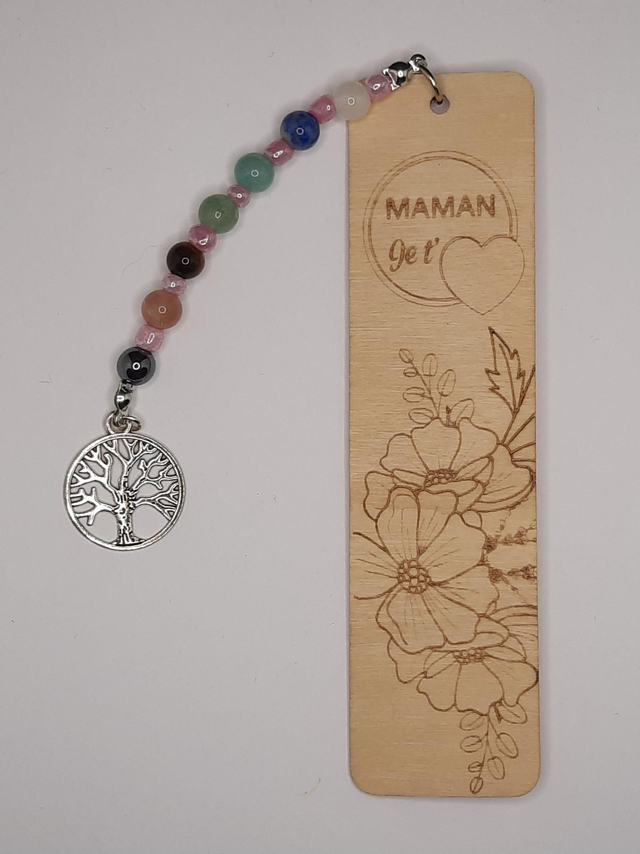 Marque page en bois avec gravure laser personnalisable sur demande.Accompagné de perles gemmes et breloque arbre de vie