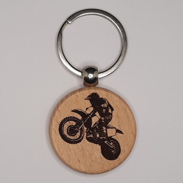 Porte-clés en bois avec gravure laser sur les 2 faces. Motif moto cross. Personnalisable à la demande