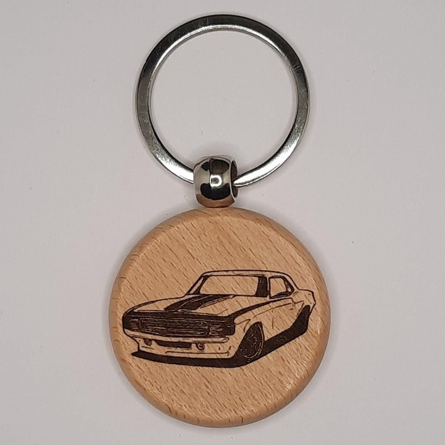 Porte-clés en bois avec gravure laser sur les 2 faces.Motif pick-up muscle car.Personnalisable à la demande