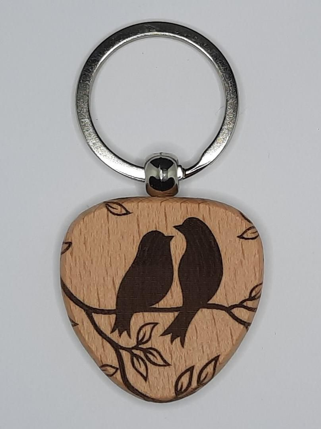 Porte-clés en bois avec gravure laser sur les 2 faces. Motif oiseaux. Personnalisable à la demande