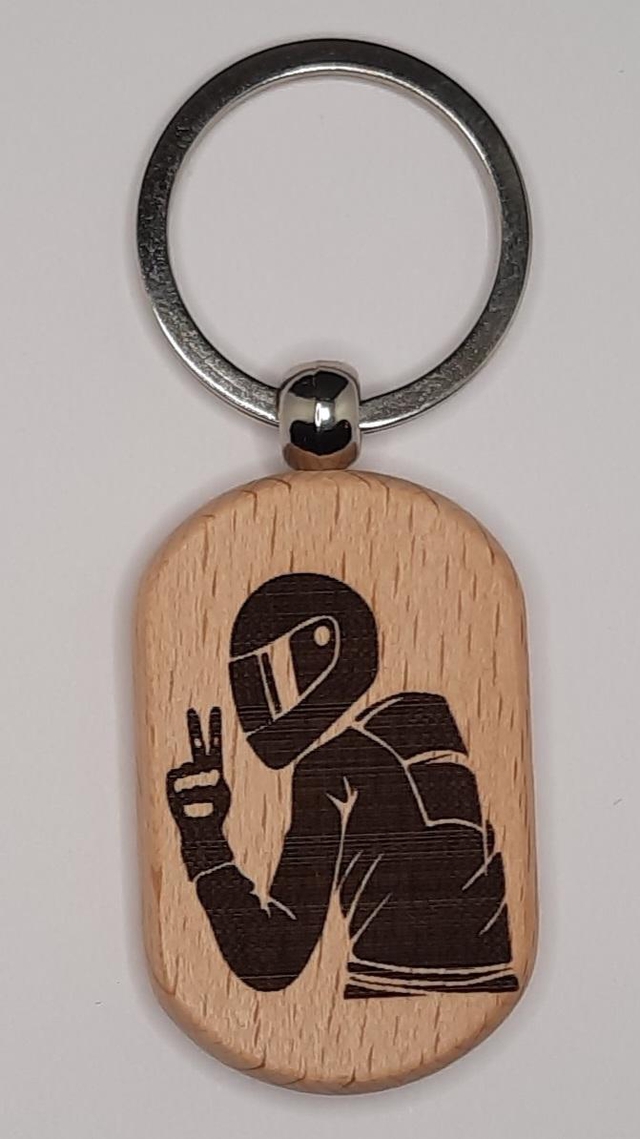 Porte-clés en bois avec gravure laser sur les 2 faces. Motif motard. Personnalisable à la demande