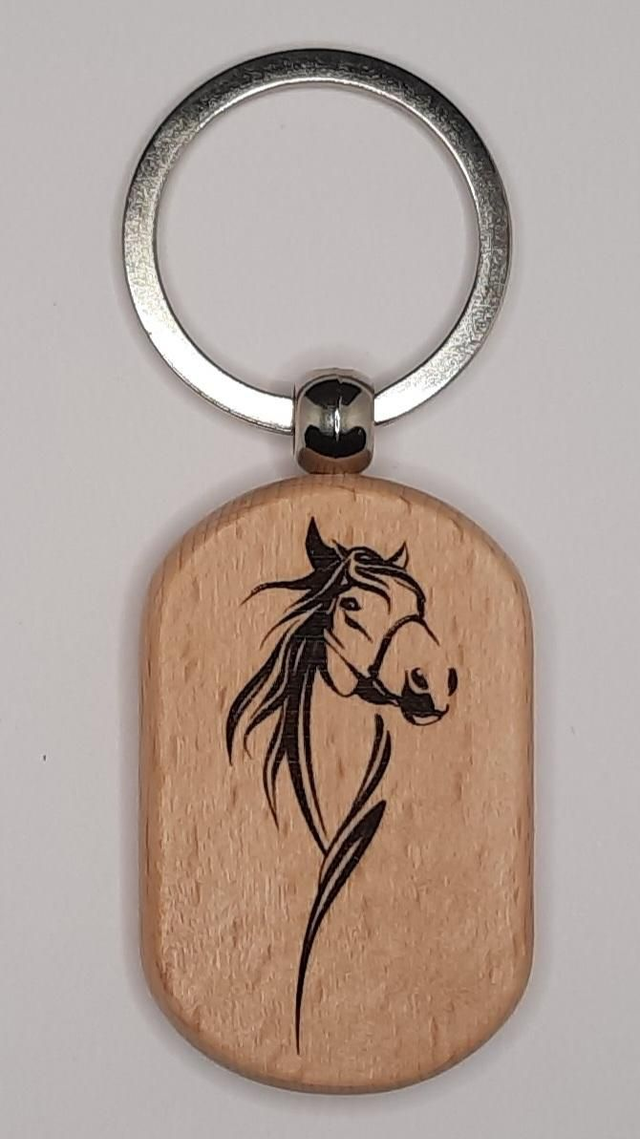 Porte-clés en bois avec gravure laser sur les 2 faces. Motif cheval. Personnalisable à la demande