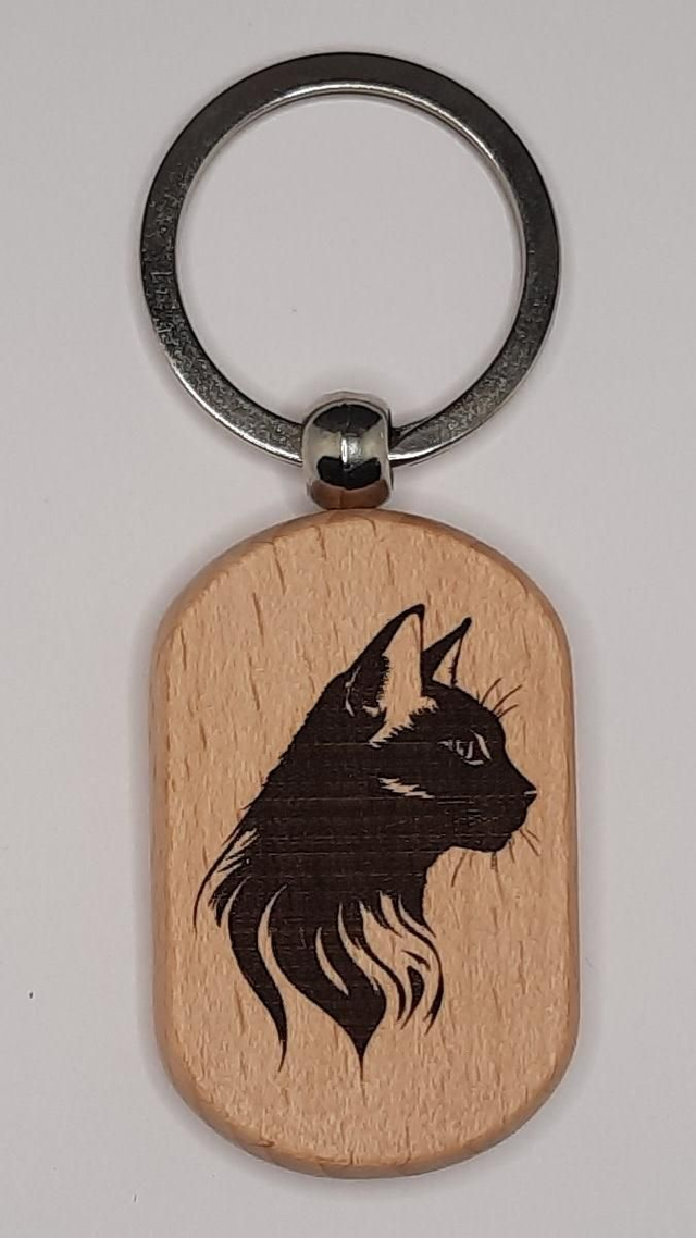 Porte-clés en bois avec gravure laser sur les 2 faces. Motif chat. Personnalisable à la demande