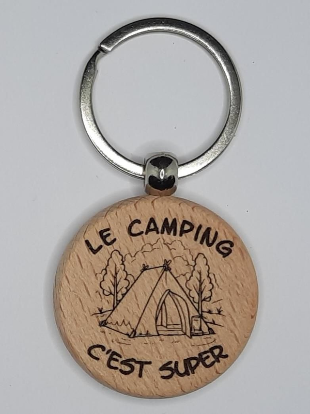 Porte-clés en bois avec gravure laser sur les 2 faces. Motif camping. Personnalisable à la demande