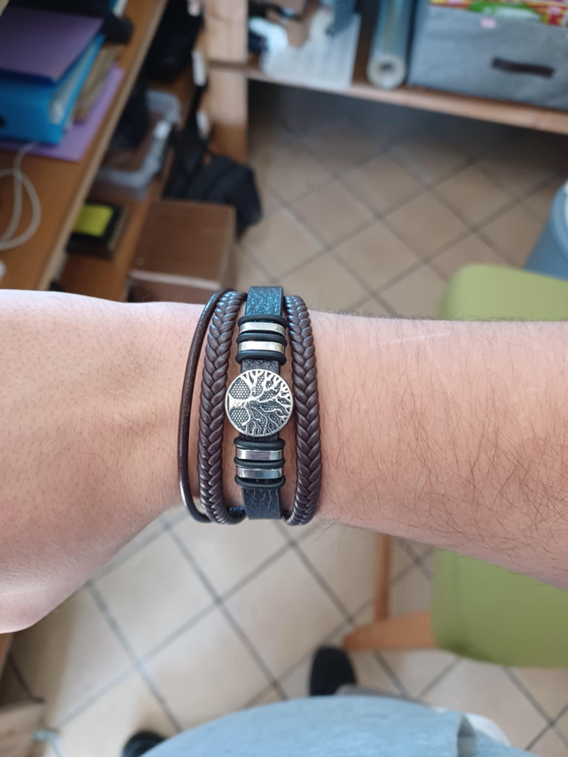 Bracelet homme en simili cuir avec un arbre de vie en acier inoxydable. Couleur noir, bleu ou marron.